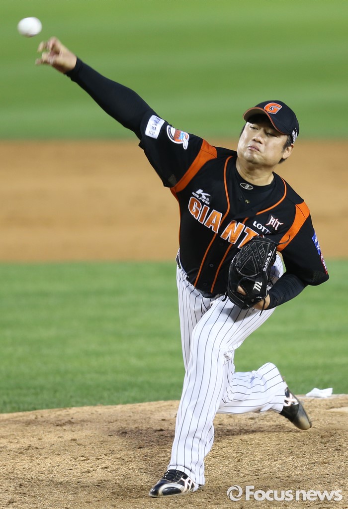 (서울=포커스뉴스) 12일 서울 잠실구장에서 열린 2016 프로야구 롯데-두산 경기에서 롯데 투수 손승락이 9회말 등판해 투구하고 있다.