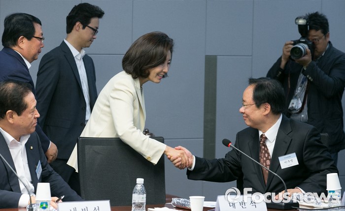 (서울=포커스뉴스) 13일 오전 서울 여의도 국회 의원회관에서 '개헌, 우리 시대의 과제'란 주제로 열린 14차 국가전략포럼에 참석한 나경원, 이주영 새누리당 의원이 인사하고 있다.