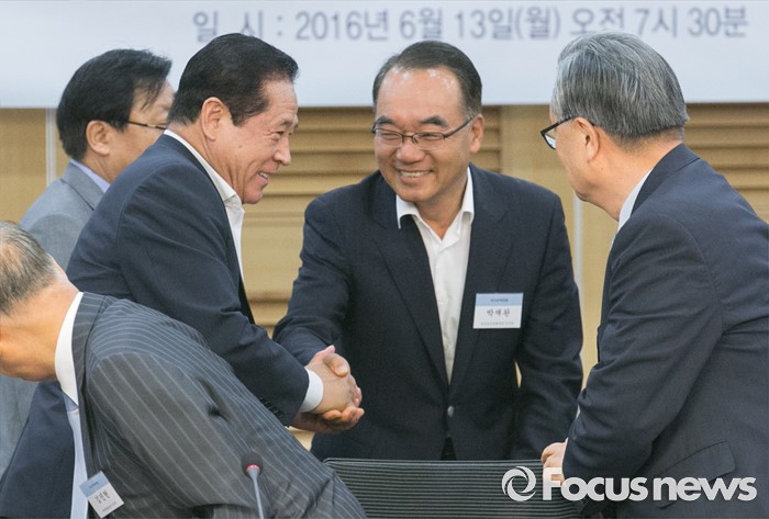 (서울=포커스뉴스) 13일 오전 서울 여의도 국회 의원회관에서 '개헌, 우리 시대의 과제'란 주제로 열린 14차 국가전략포럼에 참석한 배덕광(왼쪽) 새누리당 의원과 박재완(가운데) 한반도선진화재단 이사장이 인사하고 있다.