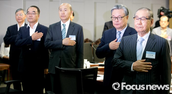 (서울=포커스뉴스) 13일 오전 서울 여의도 국회 의원회관에서 '개헌, 우리 시대의 과제'란 주제로 열린 14차 국가전략포럼에 참석한 김진현(오른쪽부터) 세계평화포럼 이사장, 인명진 목사, 이만의 전 환경부 장관, 박재완 한반도선진화재단 이사장 등 참석자들이 국기에 대한 경례를 하고 있다.