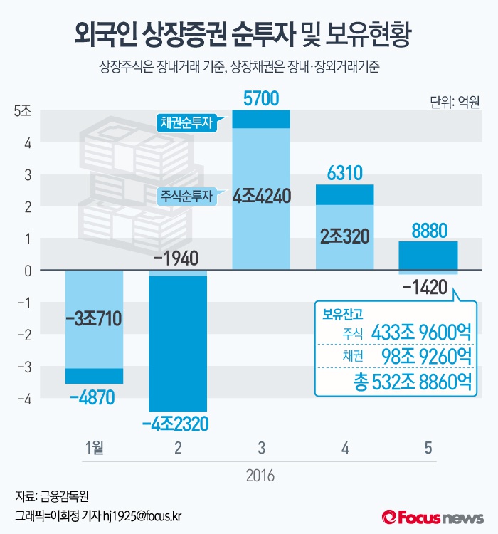 (서울=포커스뉴스) 금융감독원은 지난 4월 중 외국인 투자자가 주식과 채권을 각각 1420억원, 8880억원 매수하면서 7460억원이 한국 증권시장에 순유입됐다고 13일 밝혔다.