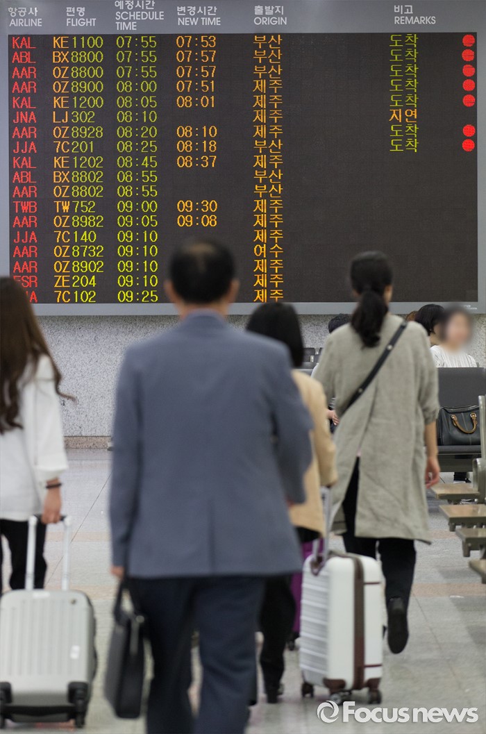 (서울=포커스뉴스) 13일 오전 서울 김포공항 국내선 청사에 항공기 도착 정보가 게시되고 있다. 지난 12일 오후 저시정특보가 내려진 제주공항은 짙은 안개와 연결편 문제로 150여편 지연 운항, 2편 결항했지만 13일 오전 6시에 특보를 해제했으며 오전 9시 현재 모든 항공편이 정상 운항하고 있다고 밝혔다.