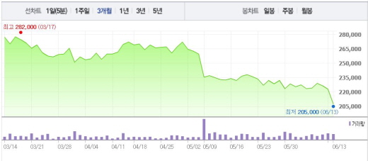 투자의견에 대해서는 기존 ‘매수’에서 ‘중립’으로, 목표주가를 30만원에서 25만원으로 하향 조정했다.주가흐름<사진출처=네이버 캡쳐>