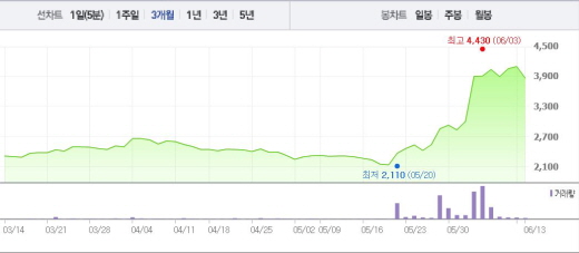 이는 1달 전 주가인 5월13일(2295원)과 비교했을 때 67.9% 상승한 수치다.