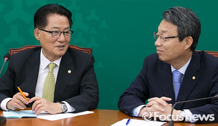(서울=포커스뉴스) 13일 오전 서울 여의도 국회에서 열린 국민의당 최고위원회의에 참석한 박지원(왼쪽) 원내대표와 김성식 정책위의장이 대화하고 있다.