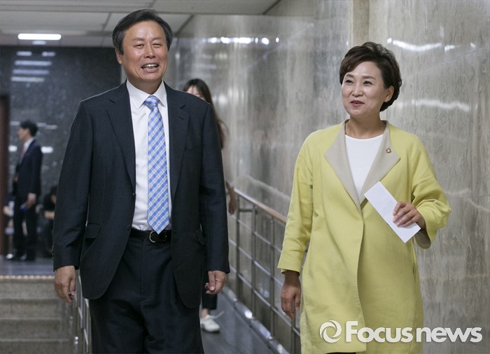 (서울=포커스뉴스) 13일 오전 서울 여의도 국회에서 열린 더불어민주당 비공개 의원총회에 예산결산특별위원장으로 내정된 김현미(오른쪽) 의원과 도종환 의원이 입장하고 있다.