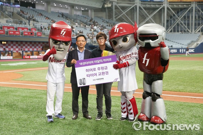넥센타이어는 이 씨의 선행에 감사하는 마음으로 경기 시구와 더불어 이 달의 히어로 표창장 과 후원금, 타이어를 전달했다.