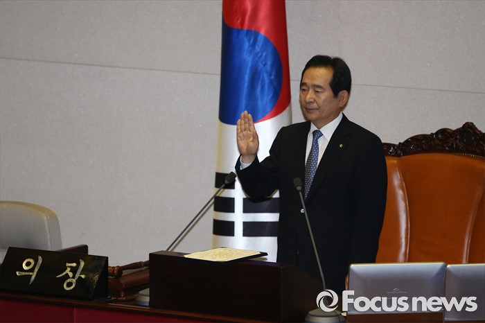 (서울=포커스뉴스) 13일 오전 서울 여의도 국회에서 열린 20대 국회 개원식에 참석한 정세균 국회의장이 선서를 하고 있다.
