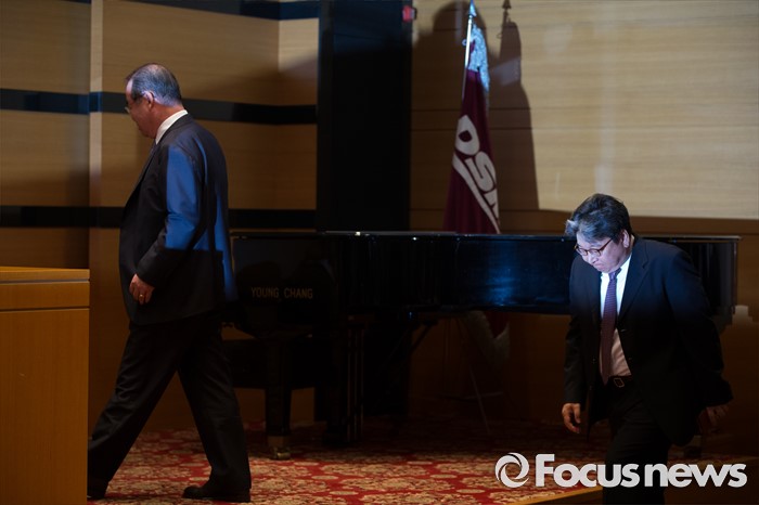 (서울=포커스뉴스) 13일 오전 서울 중구 대우조선해양 본사 대회의실에서 열린 '제17기 제2차 임시주주총회'에 정성립 대우조선해양 대표이사(왼쪽)와 이상근 감사위원장이 참석하고 있다.