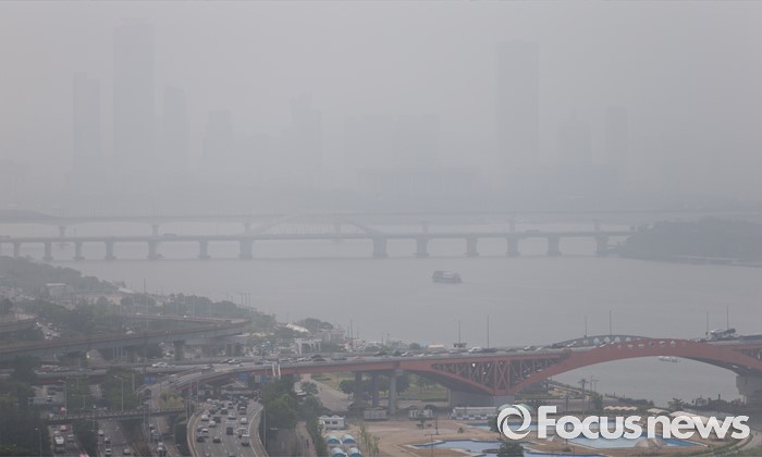 (서울=포커스뉴스) 13일 서울 마포구 하늘공원에서 바라본 한강과 서울도심이 안개로 뿌옇게 보이고 있다.