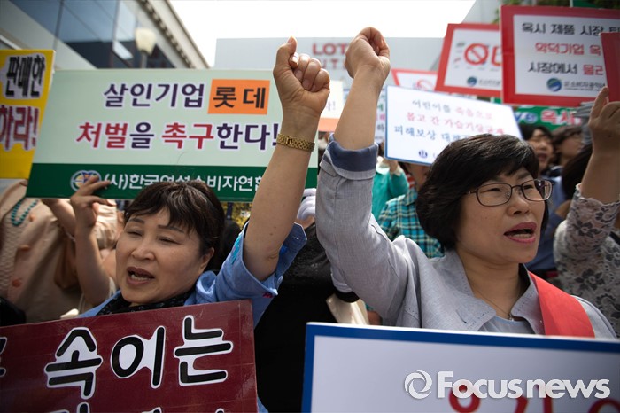 (서울=포커스뉴스) 13일 오전 서울 용산구 롯데마트 서울역점 앞에서 소비자단체 회원들이 롯데마트의 자사 가습기 살균제품 피해에 대한 책임있는 행동을 촉구하고 옥시 제품 판매 중단을 요구하는 집회를 하고 있다.