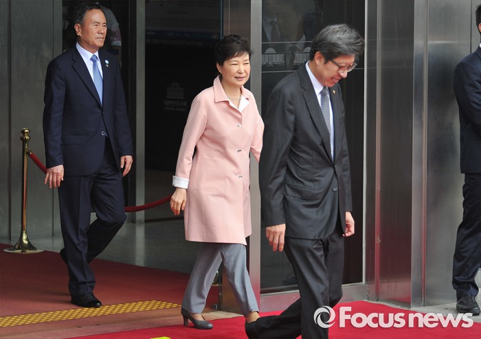 (서울=포커스뉴스) 박근혜 대통령이 13일 오전 서울 여의도 국회에서 열린 20대 국회 개원식에 참석한 뒤 본청을 나서고 있다.