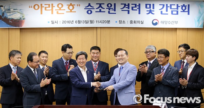 (세종=포커스뉴스) 윤학배(왼쪽 다섯 번째) 해양수산부 차관이 13일 오전 세종시 정부세종청사 해수부 중회의실에서 열린 아라온호 승조원 격려 및 간담회에서 김광헌 선장에게 기념품을 전달하고 있다.