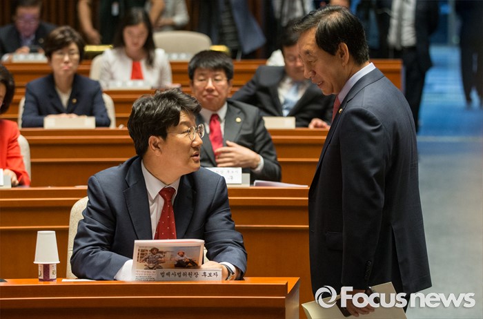 (서울=포커스뉴스) 법사위원장을 맡게 된권성동(왼쪽) 새누리당 의원이 13일 오전 서울 여의도 국회에서 열린 의원총회에서 김성태 의원과 대화하고 있다.