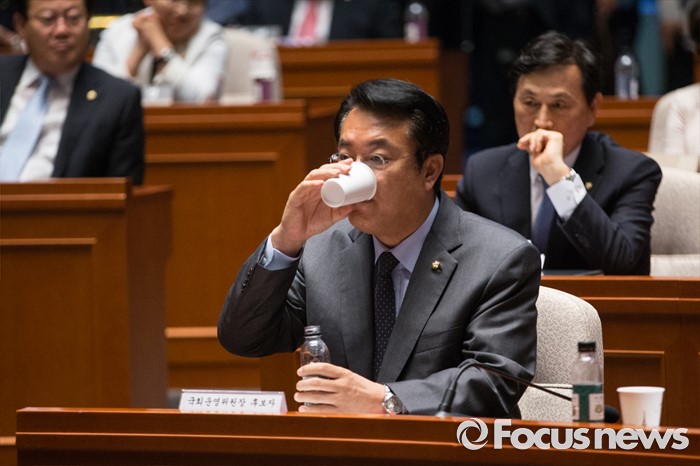 (서울=포커스뉴스) 정진석 새누리당 원내대표가 13일 오전 서울 여의도 국회에서 열린 의원총회에서 물을 마시고 있다.