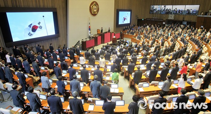 (서울=포커스뉴스) 13일 오전 서울 여의도 국회에서 열린 20대 국회 개원식에 참석한 의원들이 애국가를 제창하고 있다.