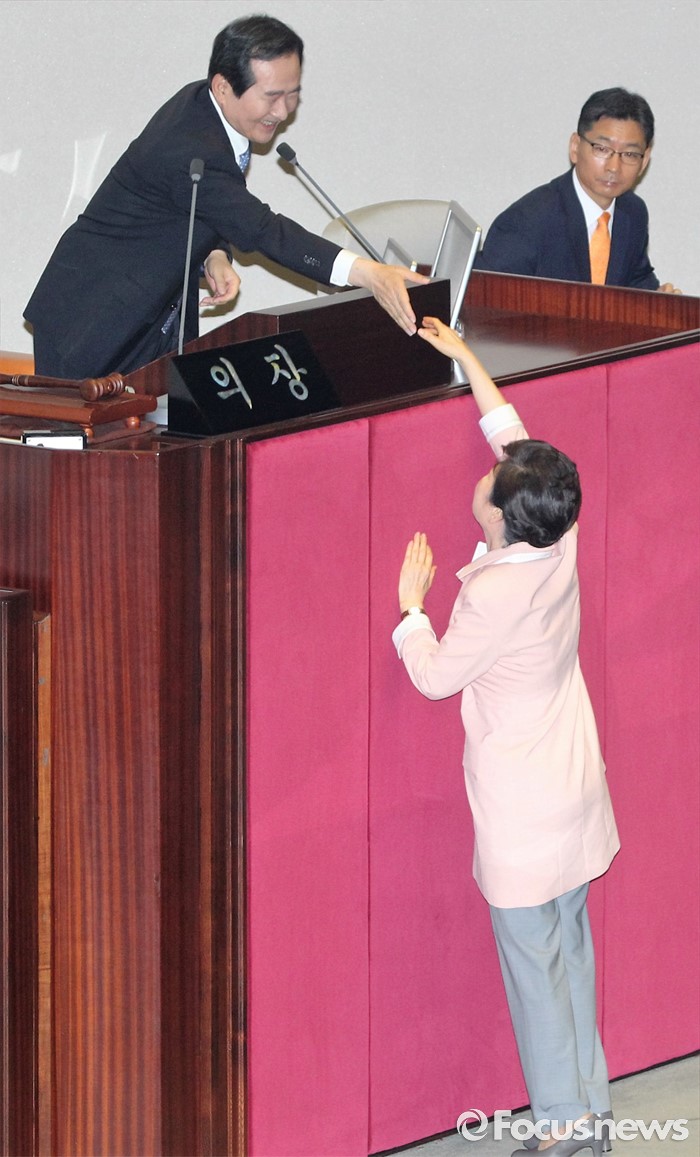 (서울=포커스뉴스) 박근혜 대통령이 13일 오전 서울 여의도 국회에서 열린 20대 국회 개원식에 참석해 연설을 마친 뒤 정세균 국회의장과 악수하고 있다.