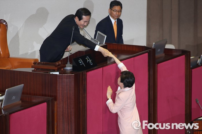 (서울=포커스뉴스) 박근혜 대통령이 13일 오전 서울 여의도 국회에서 열린 20대 국회 개원식에 참석해 연설을 마친 뒤 정세균 국회의장과 악수하고 있다.