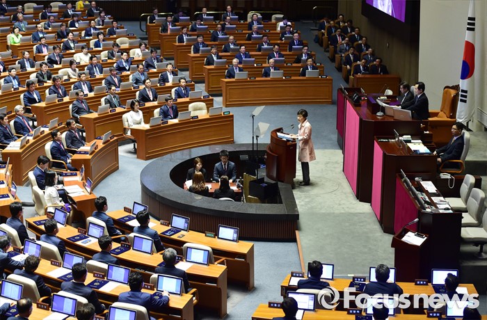(서울=포커스뉴스) 박근혜 대통령이 13일 오전 서울 여의도 국회에서 열린 20대 국회 개원식에 참석해 연설을 하고 있다.