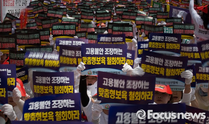 (서울=포커스뉴스) 13일 오후 서울 여의도 KB국민은행 앞에서 한국가정어린이집연합회 회원들이 맞춤형 보육 저지와 누리과정 예산 해결 및 평등지원 촉구 결의대회를 하고 있다.