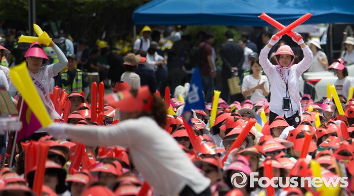 (서울=포커스뉴스) 13일 오후 서울 여의도 KB국민은행 앞에서 한국가정어린이집연합회 회원들이 맞춤형 보육 저지와 누리과정 예산 해결 및 평등지원을 촉구하는 손피켓을 들고 있다.