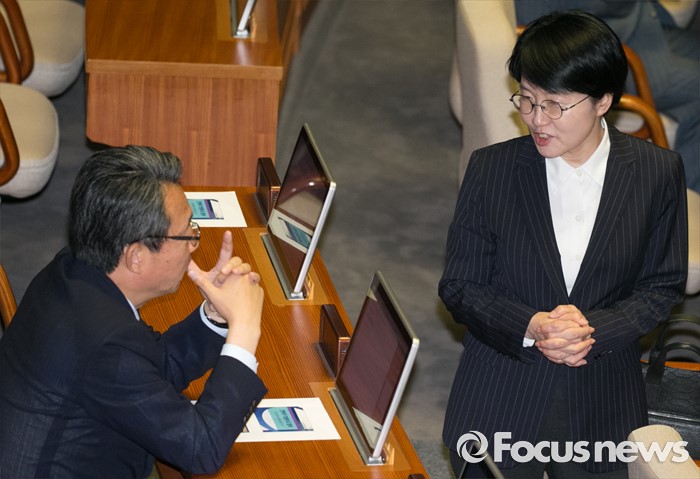 (서울=포커스뉴스) 13일 오후 서울 여의도 국회에서 상임위원장 선출을 위해 열린 343회 국회(임시회) 2차 본회의에 참석한 김성식(왼쪽) 국민의당 정책위의장과 박선숙 의원이 대화하고 있다.