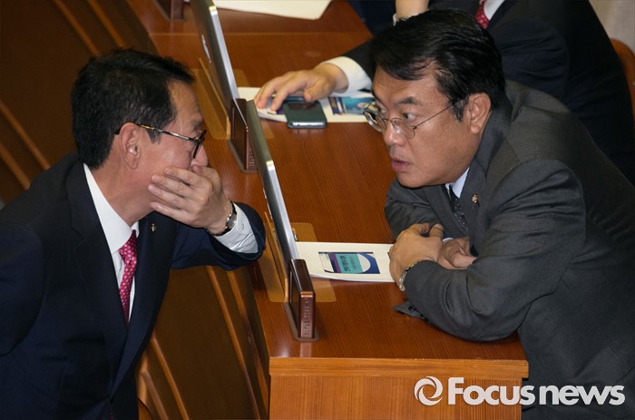 (서울=포커스뉴스) 13일 오후 서울 여의도 국회에서 상임위원장 선출을 위해 열린 343회 국회(임시회) 2차 본회의에 참석한 정진석(오른쪽) 새누리당 원내대표와 김도읍 원내수석부대표가 대화하고 있다.