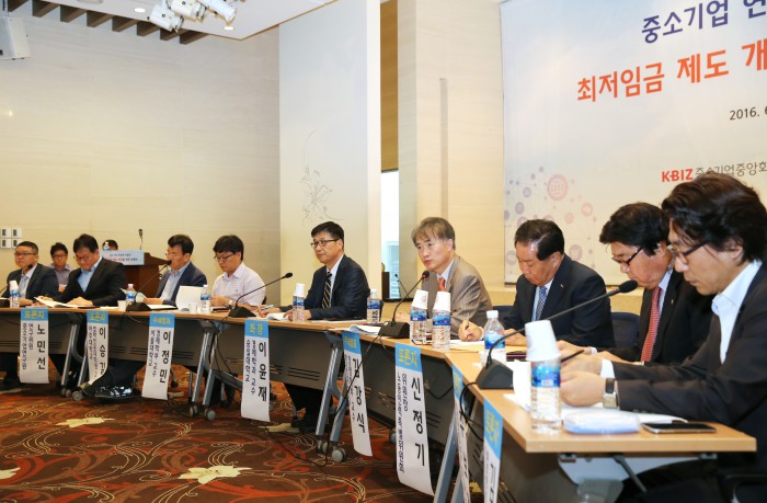 박성택 중기중앙회장은 "우리나라는 OECD(경제협력개발기구) 국가 중 영세 기업 종사자 비중이 2번째에 이를 만큼 매우 높아 최저임금 인상이 일자리 감소로 직결될 우려가 크다"며 "최저임금 제도개선 논의가 실질적 지급주체인 중소기업과 소상공인의 현실을 충분히 반영해야 할 것"이라고 강조했다.왼쪽부터 노민선 중소기업연구원 연구위원, 이승길 아주대 법학전문대학원 교수, 이정민 서울대 경제학부 교수, 이윤재 숭실대 경제학과 교수, 김강식 항공대 경영학부 교수, 신정기 노동인력특별위원회 위원장, 주보원 한국금속열처리공업협동조합 이사장이 '중소기업 현실에 적합한 최저임금 제도 개선'에 대한 토론를 벌이고 있다.
