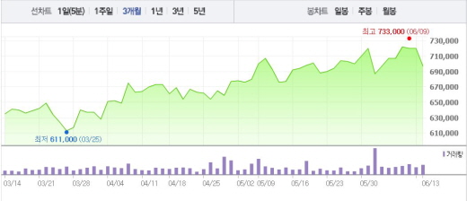 이어 공 연구원은 “네이버의 현재 기업 가치가 텐센트와 동조화 돼 있는데 라인 상장시 포털 가치의 피어(peer·그룹)는 구글로 바뀌게 된다”며 “라인의 공모가를 반영했을 때 네이버의 적정 주가는 55만원에 불과하다”고 말했다.주가흐름<사진출처=네이버 캡쳐>