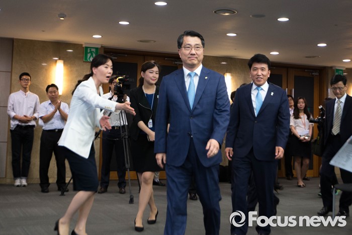 (서울=포커스뉴스) 진웅섭(사진 정면 첫번째) 금융감독원장과 함영주 KEB 하나은행장이 13일 오후 서울 중구 KEB 하나은행 본점에서 열린 'One Bank, New Start' 선언식에 참석하고 있다.