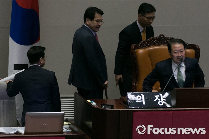 (서울=포커스뉴스) 13일 오후 서울 여의도 국회에서 상임위원장 선출을 위해 열린 343회 국회(임시회) 2차 본회의에 참석한 심재철(왼쪽 두번째), 박주선(오른쪽 첫번째) 국회 부의장이 자리 교대를 하고 있다.