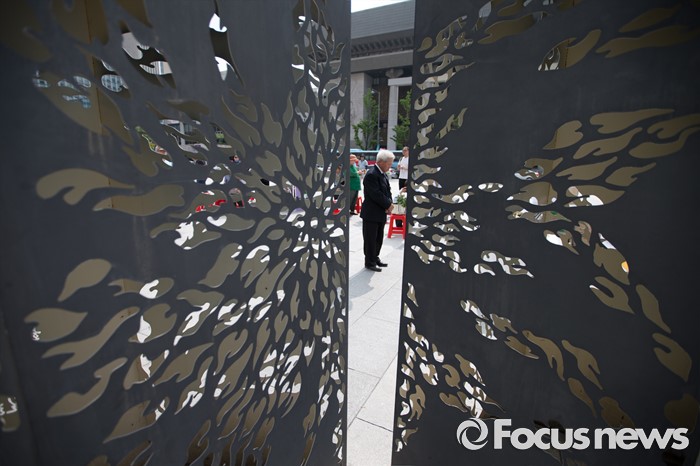 (서울=포커스뉴스) 2002년 미군 궤도차량에 치여 숨진 고(故) 신효순·심미선 양 14주기인 13일 오후 서울 종로구 광화문 광장에 마련된 분향소에서 추모비 사이로 참가자가 보이고 있다.
