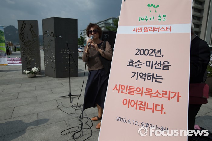 (서울=포커스뉴스) 2002년 미군 궤도차량에 치여 숨진 고(故) 신효순·심미선 양 14주기인 13일 오후 서울 종로구 광화문 광장에 마련된 추모공간에서 참가자가 추모 안내를 하고 있다.
