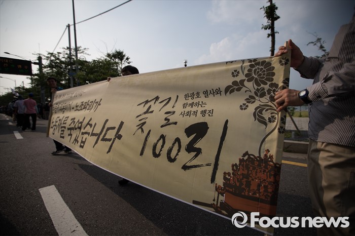 (서울=포커스뉴스) 13일 오후 유성기업 노동자 故 한광호씨의 분향소를 양재동 현대차 본사 앞으로 옮기는 꽃길 100리 행진에 참여한 노동자들이 시청 분향소를 떠나 국회를 향하고 있다.