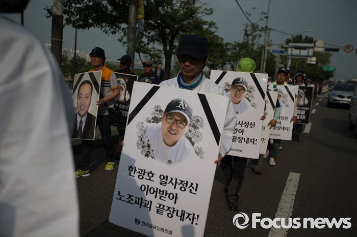 (서울=포커스뉴스) 13일 오후 유성기업 노동자 故 한광호씨의 분향소를 양재동 현대차 본사 앞으로 옮기는 꽃길 100리 행진에 참여한 노동자들이 시청 분향소를 떠나 국회를 향하고 있다.