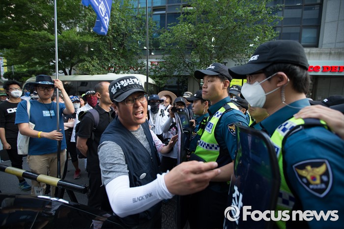 (서울=포커스뉴스) 13일 오후 유성기업 노동자 故 한광호씨의 분향소를 양재동 현대차 본사 앞으로 옮기는 꽃길 100리 행진에 참여한 노동자들이 시청 분향소에서 출발해 국회로 행진하던 중 더불어 민주당 당사 앞에서 경찰과 대치하고 있다.