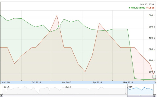매도신호란 월요일 장마감후 투자심리에 따른 종목의 매도 방향성이 감지된다는 뜻이다. 크라운제과에 대한 투자심리를 의미하는 DII 지수는 38로 강한 매도 심리를 나타내고 있다.