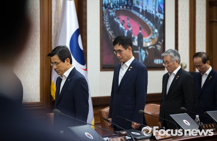 (서울=포커스뉴스) 14일 오전 서울 종로구 정부서울청사에서 열린 국무회의에 참석한 황교안 국무총리가 묵념을 하고 있다.