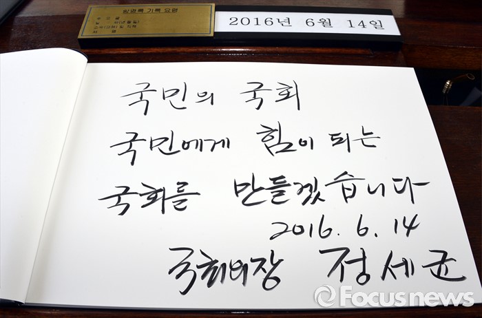 (서울=포커스뉴스) 정세균 국회의장이 14일 오전 동작구 국립서울현충원을 방문해 참배를 마친 뒤 방명록을 작성했다. 사진은 정 의장이 남긴 글귀.