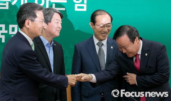 (서울=포커스뉴스) 안철수(왼쪽 두번째) 국민의당 상임공동대표, 천정배(왼쪽 첫번째) 공동대표가 14일 오전 서울 여의도 국회를 방문한 이원종(오른쪽 두번째) 대통령비서실장, 김재원 청와대 정무수석과 인사하고 있다.