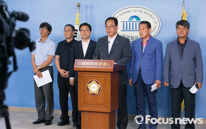 (서울=포커스뉴스) 어기구(오른쪽 세번째) 더불어민주당 의원과 충남 석탄화력발전소 설치지역 관련 기초단체장들이 14일 오전 서울 여의도 국회 정론관에서 미세먼지 대책관련 공동 기자회견을 하고 있다.