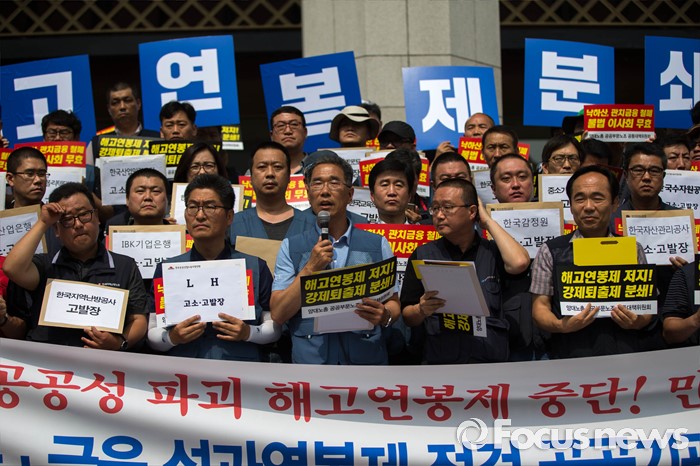 (서울=포커스뉴스) 14일 오전 서울 종로구 세종문화회관 앞에서 양대노총 공공부문공대위가 주최하는 '성과연봉제 중단 촉구 및 공공기관장 워크숍 규탄 기자회견'이 열리고 있다.