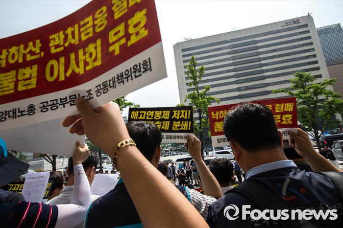 (서울=포커스뉴스) 14일 오전 서울 종로구 세종문화회관 앞에서 양대노총 공공부문공대위가 주최하는 '성과연봉제 중단 촉구 및 공공기관장 워크숍 규탄 기자회견'이 열리고 있다.