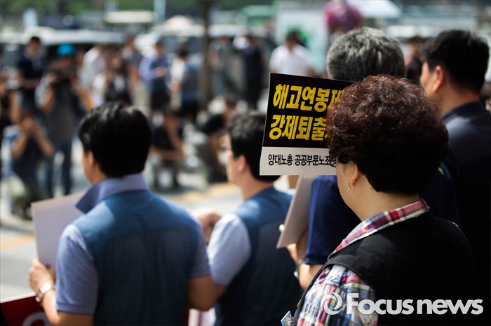 (서울=포커스뉴스) 14일 오전 서울 종로구 세종문화회관 앞에서 양대노총 공공부문공대위가 주최하는 '성과연봉제 중단 촉구 및 공공기관장 워크숍 규탄 기자회견'이 열리고 있다.
