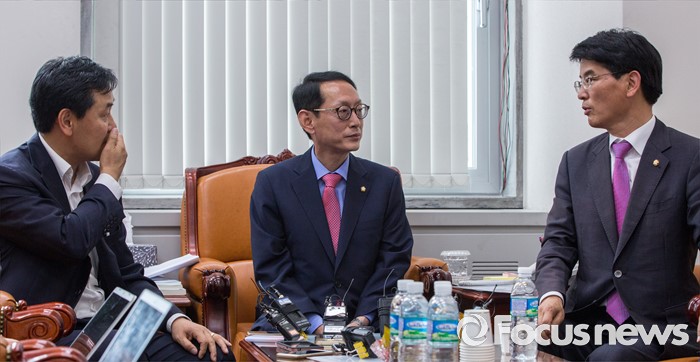 (서울=포커스뉴스) 14일 오전 서울 여의도 국회에서 3당 원내수석이 회동에 앞서 대화를 나누고 있다. 왼쪽부터 김관영 국민의당 원내수석부대표, 김도읍 새누리당 원내수석부대표, 박완주 더불어민주당 원내수석부대표.