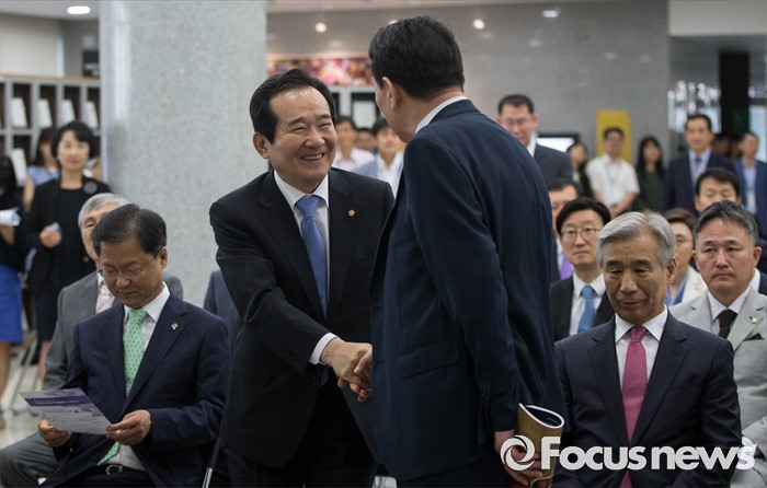 (서울=포커스뉴스) 정세균(왼쪽) 국회의장이 14일 오전 서울 여의도 국회 의원회관에서 열린 국회도서관 박람회 개막식에 참석해 의원들과 인사를 나누고 있다.