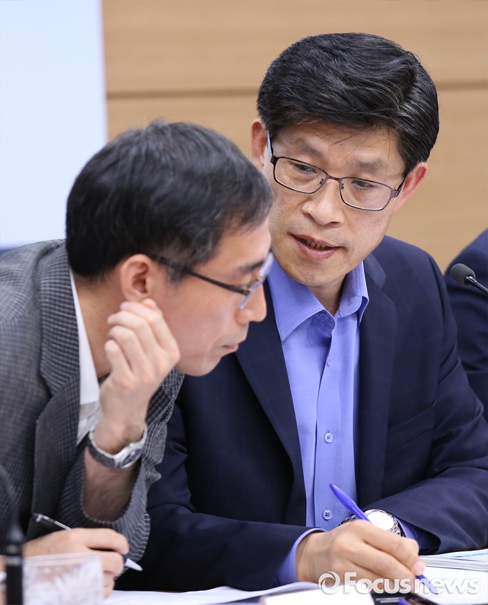 (세종=포커스뉴스) 노형욱(오른쪽) 기획재정부 재정관리관이 지난 13일 오전 정부세종청사 기재부 브리핑룸에서 열린 공공기관(에너지·환경·교육분야) 기능조정 관계부처 합동 사전브리핑에서 정기준 기획재정부 공공정책국장과 논의하고 있다.
