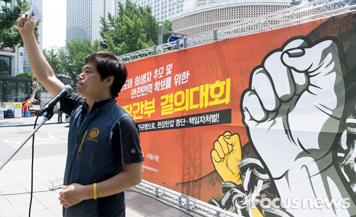 (서울=포커스뉴스) 14일 오전 서울시청 앞 인도에서 민주노총 공공운수노조와 서울지하철노조 관계자들이 스크린도어 희생자 추모 및 안전인력 확보를 위한 현장간부 결의대회를 하고 있다.