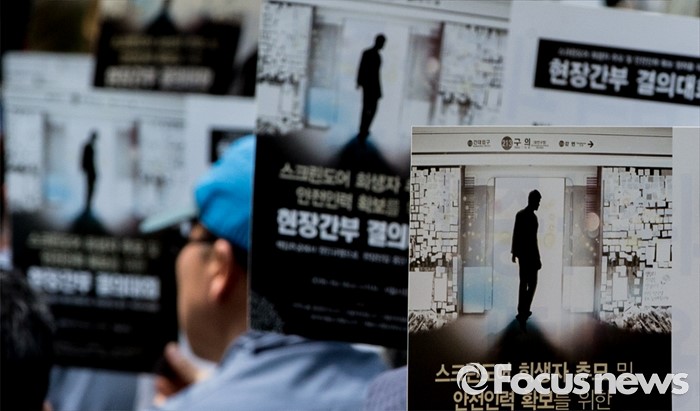 (서울=포커스뉴스) 14일 오전 서울시청 앞 인도에서 민주노총 공공운수노조와 서울지하철노조 관계자들이 스크린도어 희생자 추모 및 안전인력 확보를 위한 현장간부 결의대회를 하고 있다.