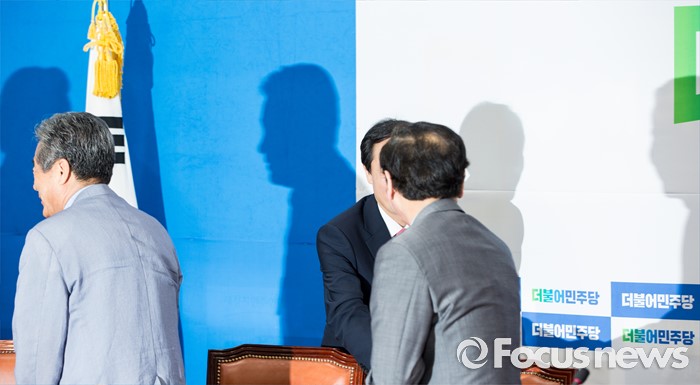 (서울=포커스뉴스) 우상호(가운데) 더불어민주당 원내대표와 정기섭 개성공단기업협회 회장이 14일 오전 서울 여의도 국회에서 면담에 앞서 악수 하고 있다.